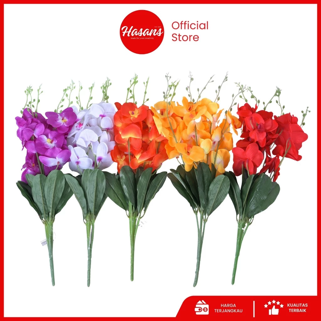 Bunga anggrek dikenal dengan keanggunannya. Produk anggrek artificial Hasans memiliki kelopak lembut dan warna menawan seperti putih, ungu, dan kuning. Ia memberi sentuhan mewah tanpa perlu perawatan rumit. Cocok sebagai centerpiece di vas tinggi.