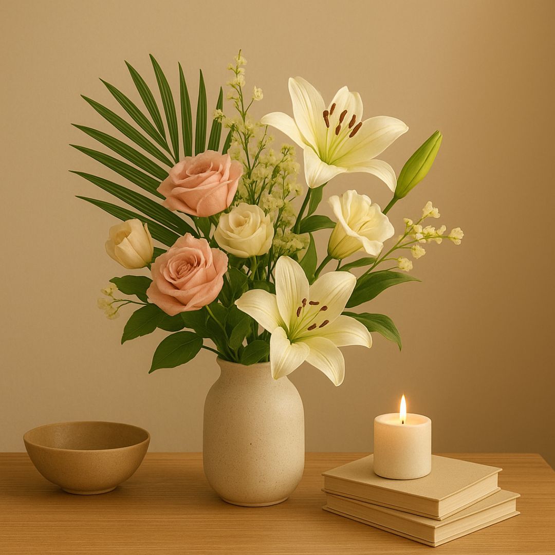 - Untuk ruang kecil, pilih vas ramping dengan bunga berwarna lembut. Pilihan ini menjaga tampilan tetap rapi tanpa terasa sesak. Satu rangkaian kecil yang seimbang lebih indah daripada dekorasi berlebihan.